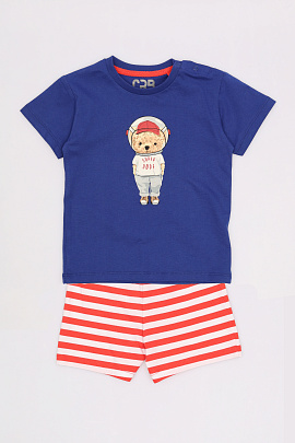 Толстовка с длинными втачными рукавами и манжетами из полотна с добавлением эластана. В нижней части толстовки расположена декоративная планка контрастного цвета. Капюшон с лицевой частью и декоративным принтом, шнурок декорирован вязаной нашивкой. Перед декорирован принтом "Панно" мир динозавров. Брюки с притачным поясом, манжетами и функциональными карманами. Пояс и манжеты выполнены из полотна с эластаном.