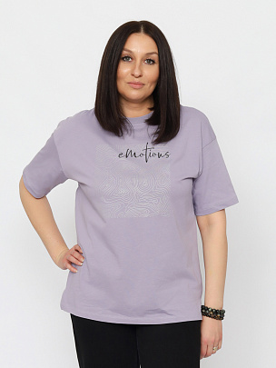 Футболка oversize с короткими рукавами. Горловина круглая, обработана притачной бейкой из рибаны с лайкрой. Перед футболки декорирован принтом с использованием глиттера.